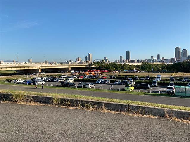 2番出口、南改札をご利用ください。新御堂筋の高架下を南に100m進むと河川敷の入口に着くことができます。土手を越えて受付へとお進みください。